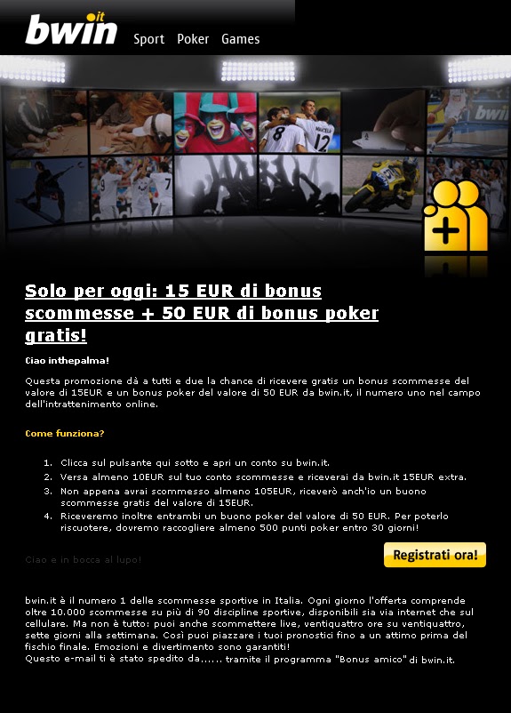 TI DIAMO LA POSSIBILITA' DI RICEVERE 15 EURO DI BONUS SCOMMESSE E 50 EURO DI BONUS POKER SPENDIBILI DA SUBITO ALLA CREAZIONE DEL CONTO BWIN, PER CORRETTEZZA TI DICIAMO CHE IL BONUS AMICO PUO' ESSERTI SPEDITO DA CHIUNQUE ABBIA UN CONTO BWIN NOI SIAMO QUI IN CASO TU VOGLIA CREARE UN CONTO BWIN E NON HAI NESSUNO CHE TE LO POSSA SPEDIRE...