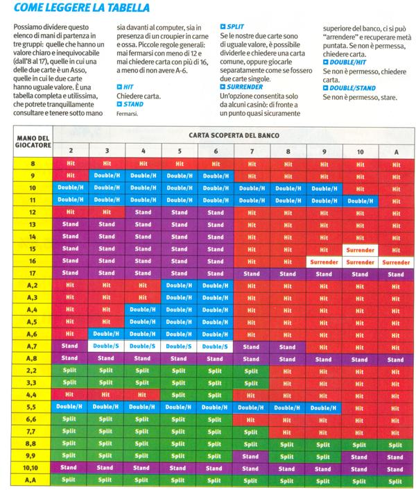 Osserviamo ora una tabella che ci indica il modo in cui è statisticamente meglio comportarsi con ogni punteggio dopo le prime due carte, tenendo anche conto della carta scoperta del banco: