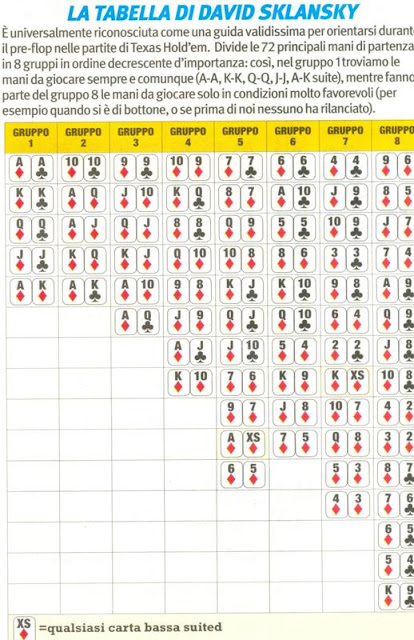 Vediamo alcuni suggerimenti su come muoversi quando ci arrivano le fatidiche 2 carte in mano (attenzione la tabella è utile anche per chi pensa di essere ad un livello già avanzato), osserviamo dunque le mani più importanti del poker racchiuse in una tabella divisa per importanza di mani in 8 gruppi, la tabella si chiama TABELLA DI "DAVID SKLANSKY"
